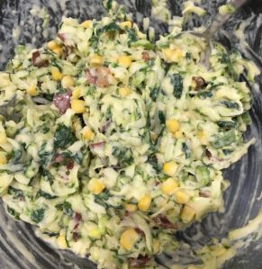 - Add the veg mix and the sweet corn to the batter mix and combine
